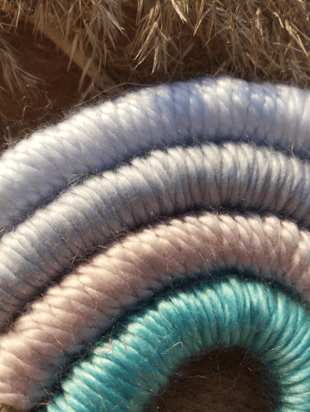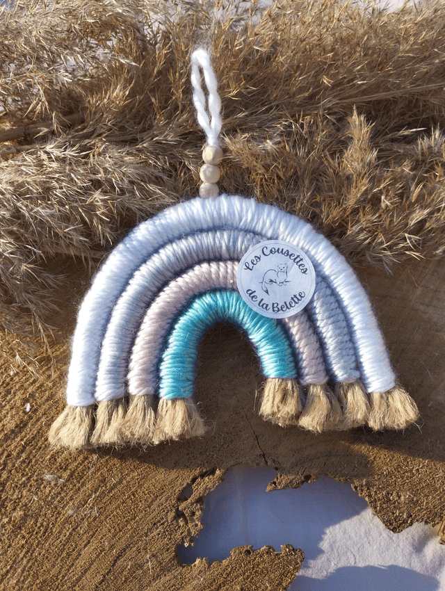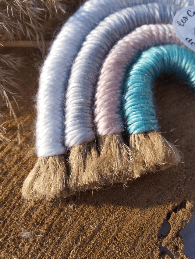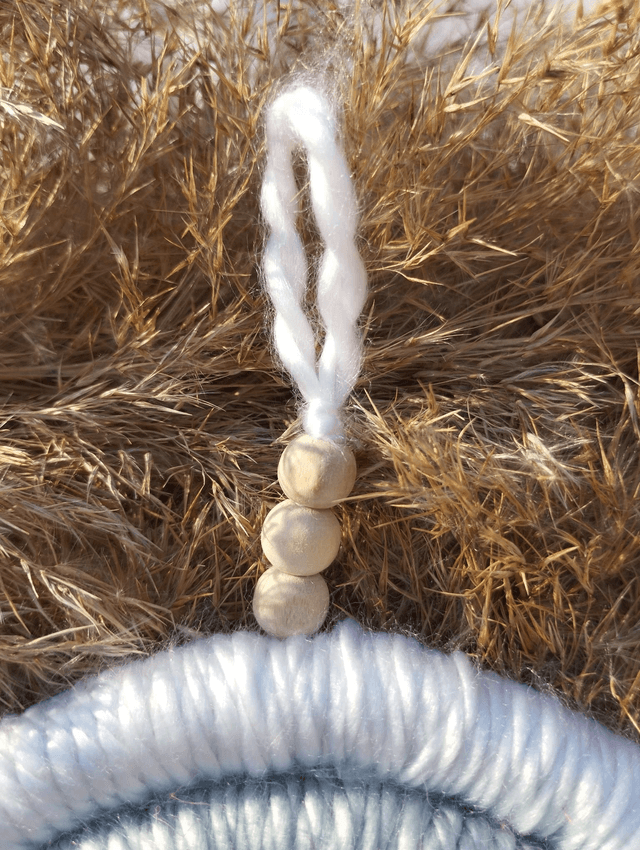 Réalisé en corde de jute, et recouvert de laine acrylique colorée. La cordelette est décorée par trois perles de bois pour apporter la touche finale